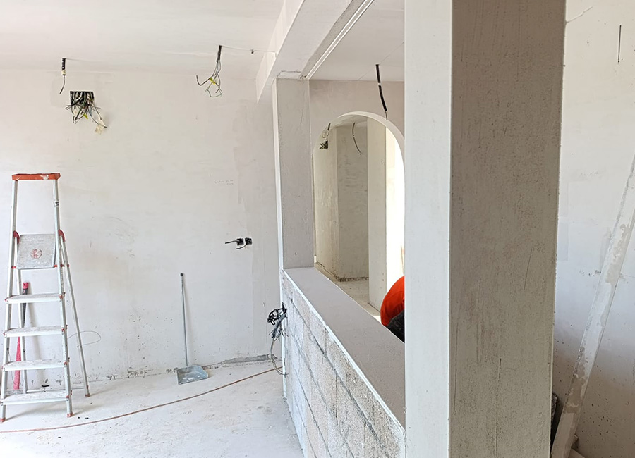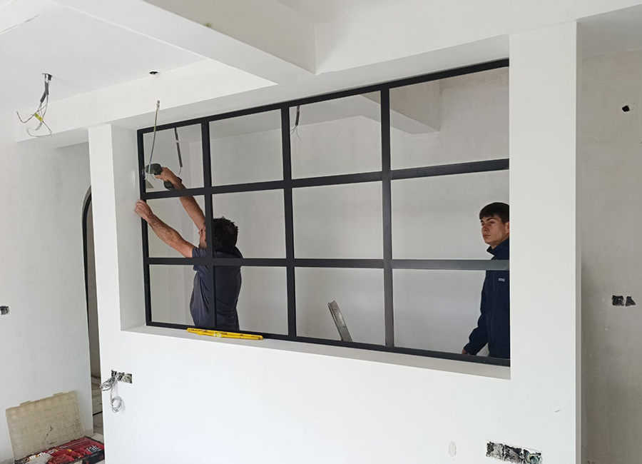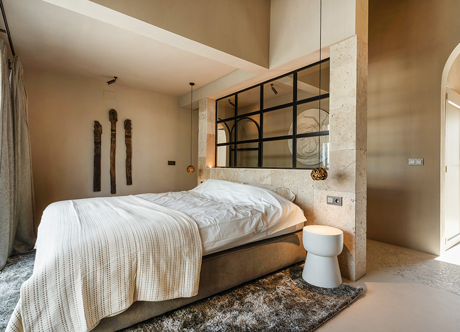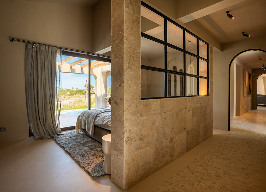 de realisatie van een wand met ramen die de hoofdslaapkamer laat doorlopen vanuit de gang, met toegang tot een eigen badkamer en behoud van privacy.