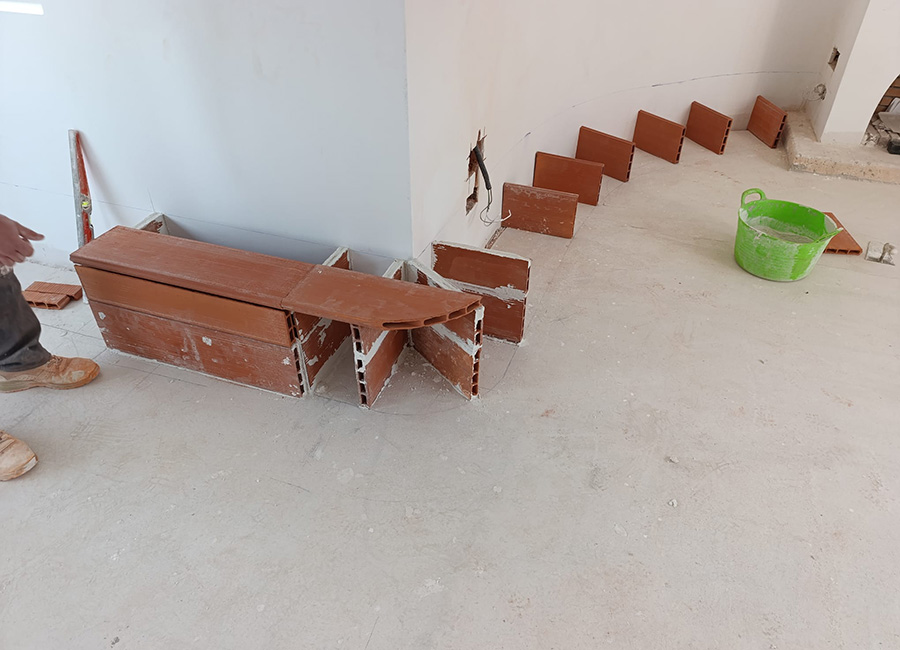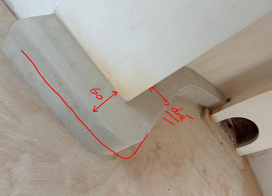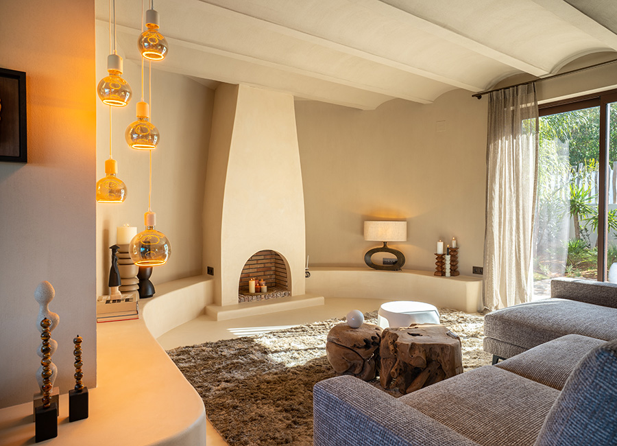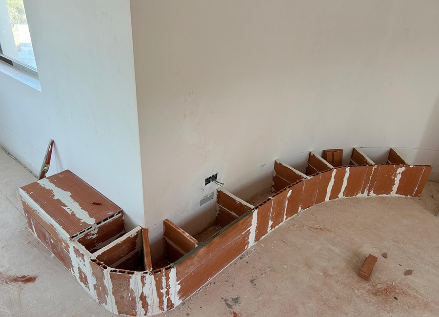 de ontwikkeling van een ronde woonruimte met haard, waarin de vorm is doorgetrokken in een royale, op maat gemaakte zitrichel.